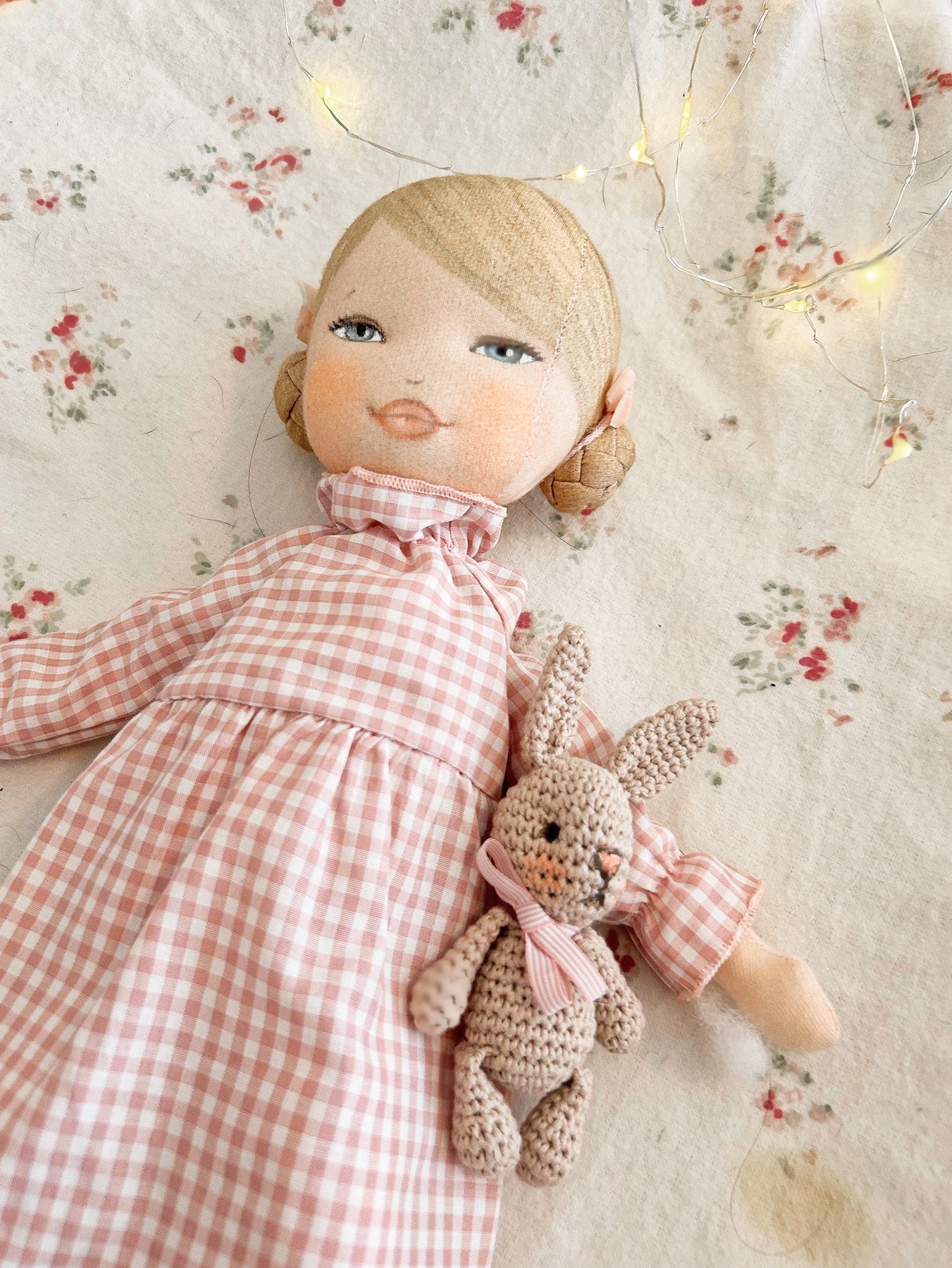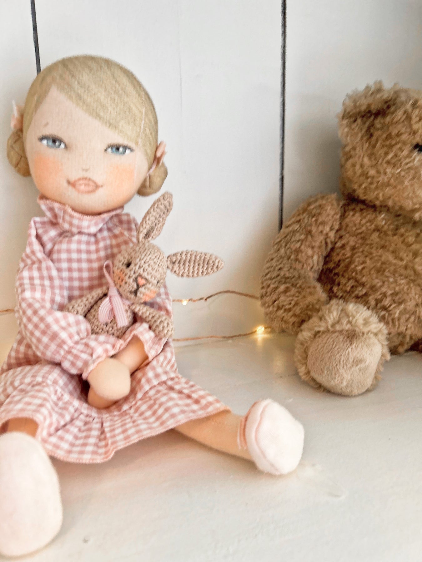 Mini Marguerite es una muñequita de tela con pelito rubio, ojos azules y moñitos trenzados. Con 36 cm, tiene el tamaño ideal para favorecer el juego y llevarla a todas partes.